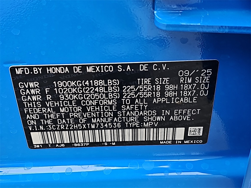 Boost Blue Pearl 2026 Honda HR-V Sport AWD CVT 2.0L I4 DOHC 16V i-VTEC ONLINE SPECIAL.